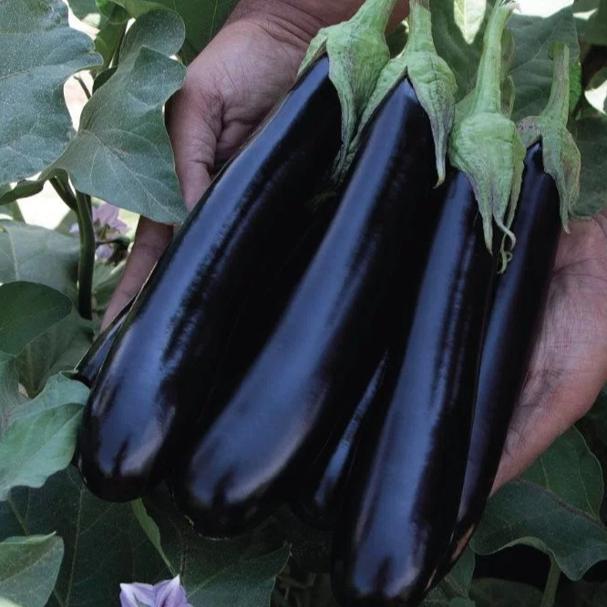 Растение сильное, пластичное, отлично адаптируется к высоким температурам и стабильно завязывает плоды даже в условиях сильной жары, обеспечивая ровный сбор с минимальными потерями. Гибрид формирует идеально выровненные, удлинённо-цилиндрические плоды длиной 25–28 см с глубоким чёрным цветом и интенсивным глянцевым блеском, что придаёт им премиальный товарный вид. Важное преимущество — полное отсутствие шипов на чашечке, что упрощает сбор и упаковку. Плоды обладают высокой плотностью, отлично переносят транспортировку и подходят для длительного хранения.