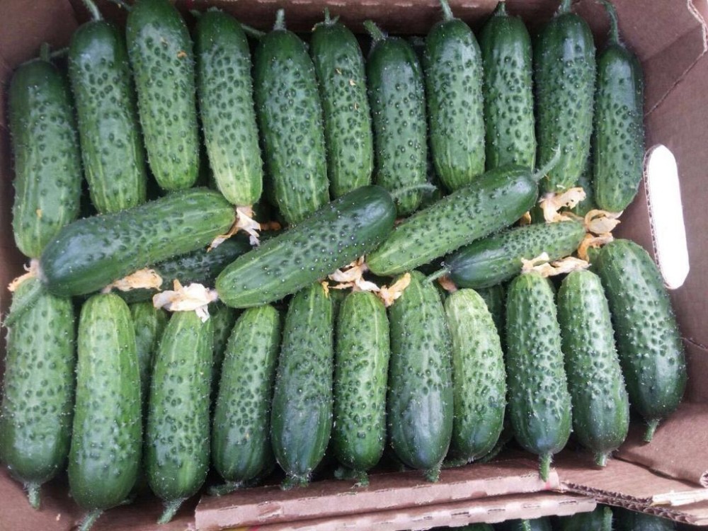 Плоды корнишонного типа, длиной 8-10 см, цилиндрической формы, с соотношением длины к диаметру 3,4:1. Окраска темно-зеленая, без желтизны. Поверхность крупнобугорчатая. Плоды генетически лишены горечи, не перерастают и не желтеют. Мякоть плотная, хрустящая, с отличными вкусовыми качествами.