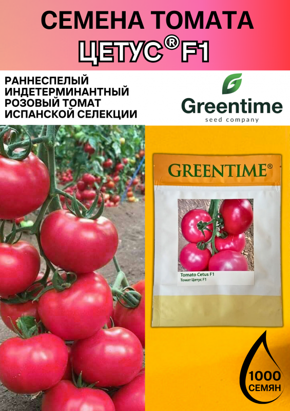 Томат Цетус F1 – ранний, индетерминантный (высокорослый) гибрид розового томата испанской селекции компании GreenTeam. Срок созревания составляет 60-65 дней от высадки рассады. Гибрид сочетает раннеспелость, высокое качество плодов и стабильную урожайность, идеально подходит для круглогодичного выращивания в любых типах теплиц, включая низкие конструкции.