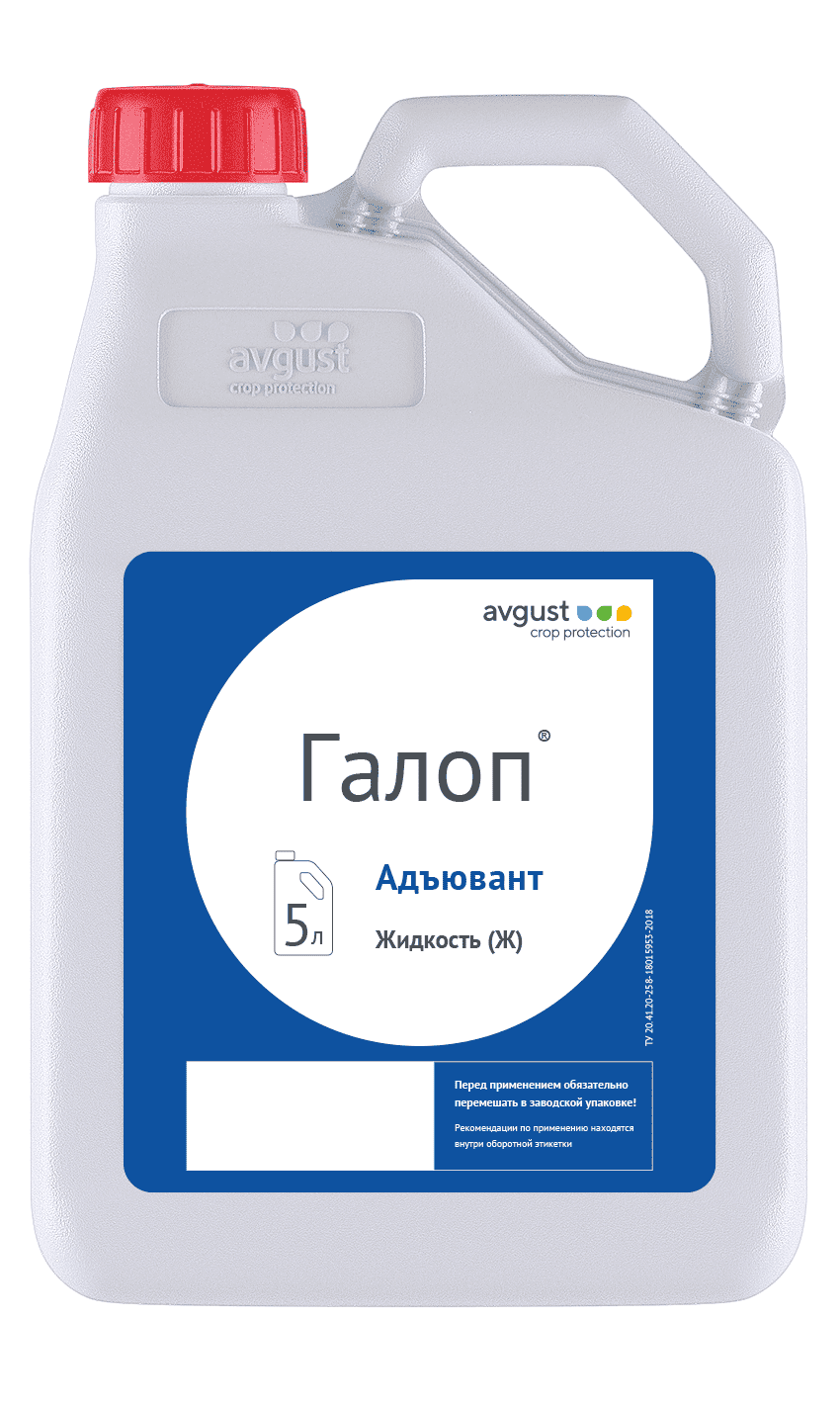Галоп® — это поверхностно-активное вещество (адъювант) от компании АО Фирма «Август» на основе смеси сложных эфиров жирных кислот, анионного сложного эфира алкилполигликозида, этоксилированных жирных спиртов и хьюмектантов, предназначенное для существенного повышения эффективности гербицидов, фунгицидов и инсектицидов. Препарат обеспечивает увеличение площади соприкосновения пестицидов с поверхностью растений, ускоряет проникновение через кутикулу, обеспечивает хорошее прилипание и распределение капель рабочего раствора, предотвращает кристаллизацию компонентов на поверхности растений, значительно повышает эффективность граминицидов и идеально совместим с гербицидами на сое, а также на сортах и гибридах рапса и подсолнечника, устойчивых к имидазолинонам.