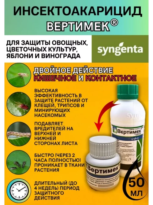 Вертимек – инсектоакарицид кишечно-контактного действия для защиты овощей защищенного грунта, цветочных и горшечных культур защищенного и открытого грунта, а также яблони и винограда от клещей, трипсов и яблонной медяницы.